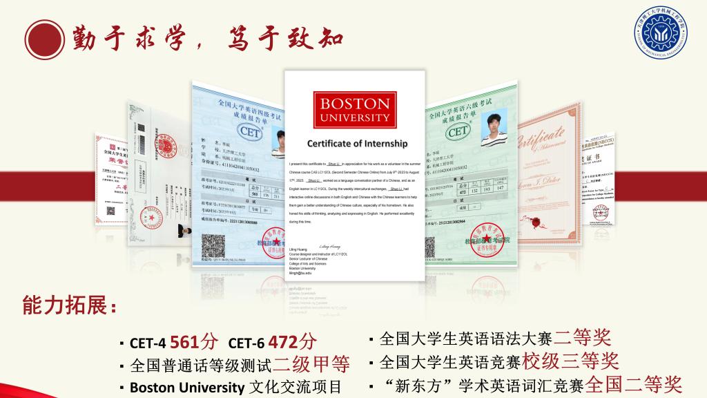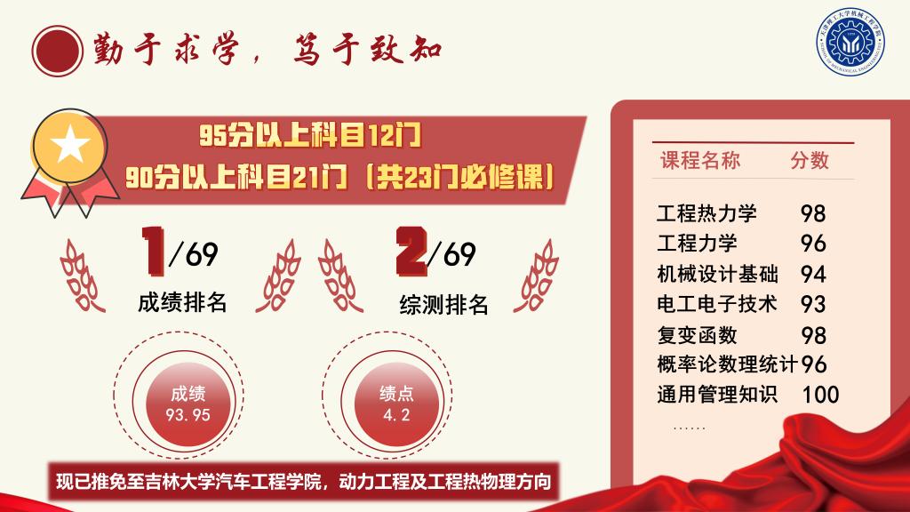 勤于求学,笃于致知。他勤奋学习,刻苦努力,64门课程中,95分及以上39门,90分及以上56门。加权平均成绩93.95分,平均绩点4.2,并以四级561分、六级472分通过大学英语四六级考试。连续三年获得人民奖学金一等奖,荣获国家奖学金,天津市优秀学生、校级“三好学生”、“理工之星”优秀学生干部等荣誉称号。
