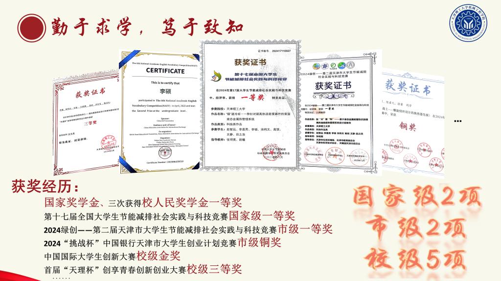 开拓创新,步履不停。他作为负责人,在“挑战杯”天津市大学生创业计划竞赛中获得铜奖,在首届“天理杯”创享青春创新创业大赛中获得三等奖,在中国国际大学生创新大赛中获得校级金奖,还获得全国大学生节能减排社会实践与科技竞赛一等奖、天津市大学生节能减排社会实践与科技竞赛一等奖等。累计获国家级奖励2项、省部级奖励2项,校级奖励5项,参与学术科研项目1项,励志以青春之力助推社会发展。