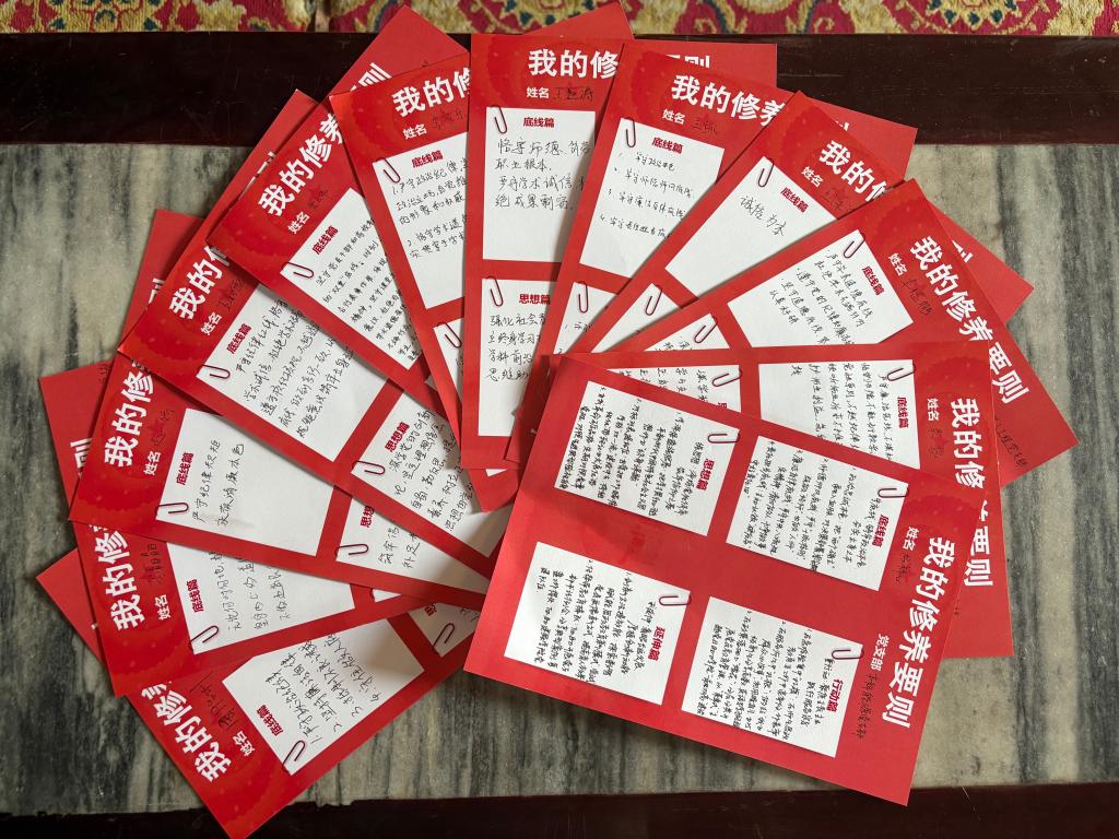笔墨丹心书写育人誓言。活动中,党员教师们结合历史感悟与工作实际,对标学院“新质生产力发展赋能九大行动”,撰写“我的修养要则”,围绕机械工程学院教师党员从铸师魂、立师德、行师道等方面,研究生党员从筑匠心、育匠行、精匠艺等方面立下庄严承诺。最后,全体党员面向党旗重温入党誓词,铮铮誓言回荡在百年建筑中,彰显出师生赓续红色血脉、勇担时代使命的坚定决心。