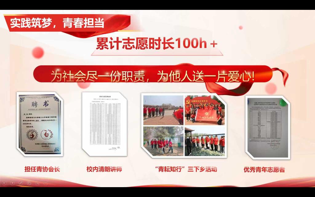 实践筑梦,青春担当。她现任院青年志愿者协会会长,始终坚信,青年的成长离不开实践的磨砺,更离不开对社会的责任与担当。以行动践行服务初心,牵头组织并深度参与各类校内实践与志愿活动。曾担任“清朗学堂”讲师,用知识传递温暖与力量,获评“优秀共青团员”荣誉称号。寒暑假期间,积极参加学院“青耘知行”实践团及社区志愿服务活动,在奉献中践行青年担当,彰显青春价值。现累计志愿时长已超100小时。