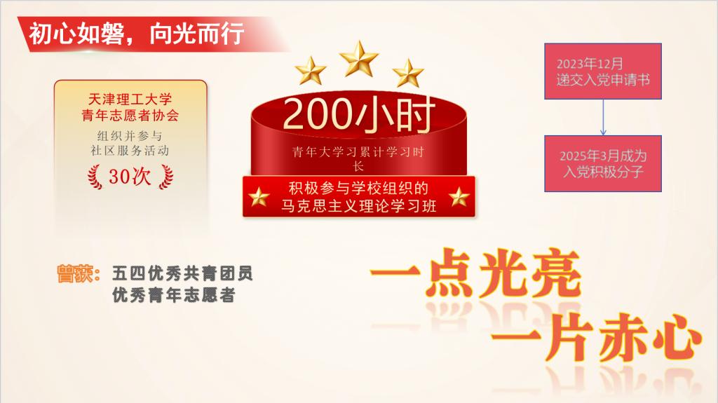 初心如磐,向光而行。思想是行动的先导,信仰是前行的力量,她始终积极向党组织靠拢,曾获五四优秀共青团员称号。只有将个人理想融入国家发展大局,才能让青春更有价值。秉持对党的坚定信仰,她以更高标准严格要求自己,不断锤炼品德修为,立志为集体发展与社会进步贡献更多青春力量。
