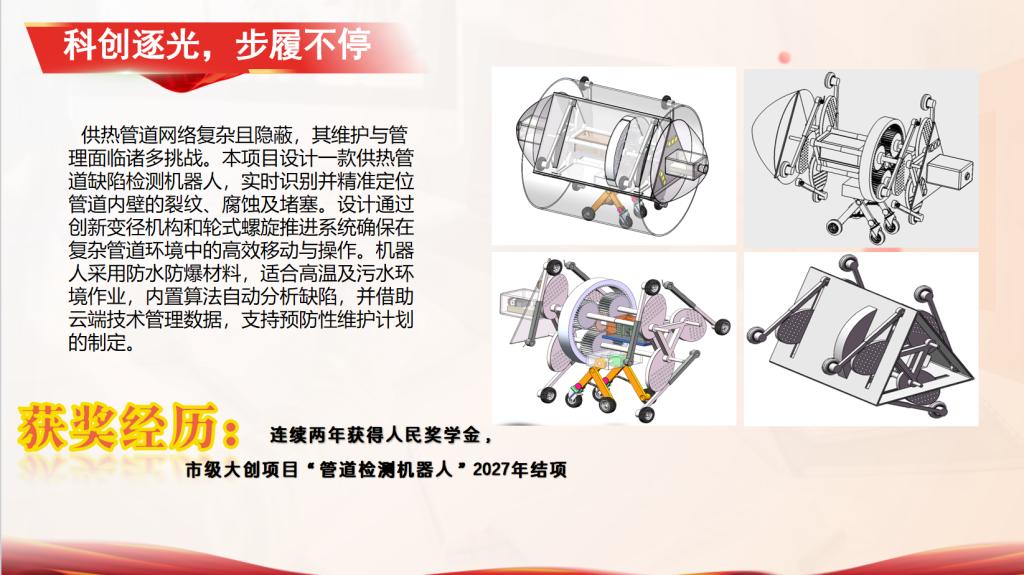 科创逐光,步履不停。她深耕专业实践,主动投身科创竞赛与科研探索,以实干锤炼创新能力。作为核心成员参与大创项目“管道机器人”研发,从方案设计、部件选型到系统调试,全程深度参与,最终项目成功闯入市级筛选环节。此外,她还积极参与新能源领域相关学科竞赛,在备赛过程中梳理专业知识点,不仅深化了对新能源设备研发、智能控制等专业知识的理解与应用,更积累了团队协作、问题攻坚的宝贵实战经验,用创新思维探索能源领域新可能,以青春力量助推技术实践落地。