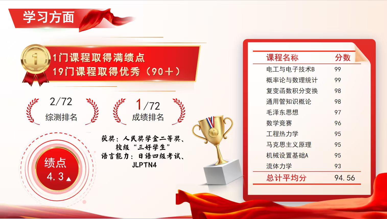 勤学善思,笃行致远。她勤奋学习,刻苦努力,深知“立身以立学为先,立学以读书为本”。大学以来43门课程中,95分及以上20门,90分及以上16门。两学年加权平均成绩94.56分,平均绩点4.3,并通过大学日语四级考试、JLPT N4。荣获国家奖学金、人民奖学金二等奖、校级“三好学生”荣誉称号等。