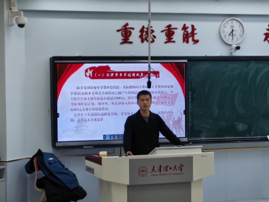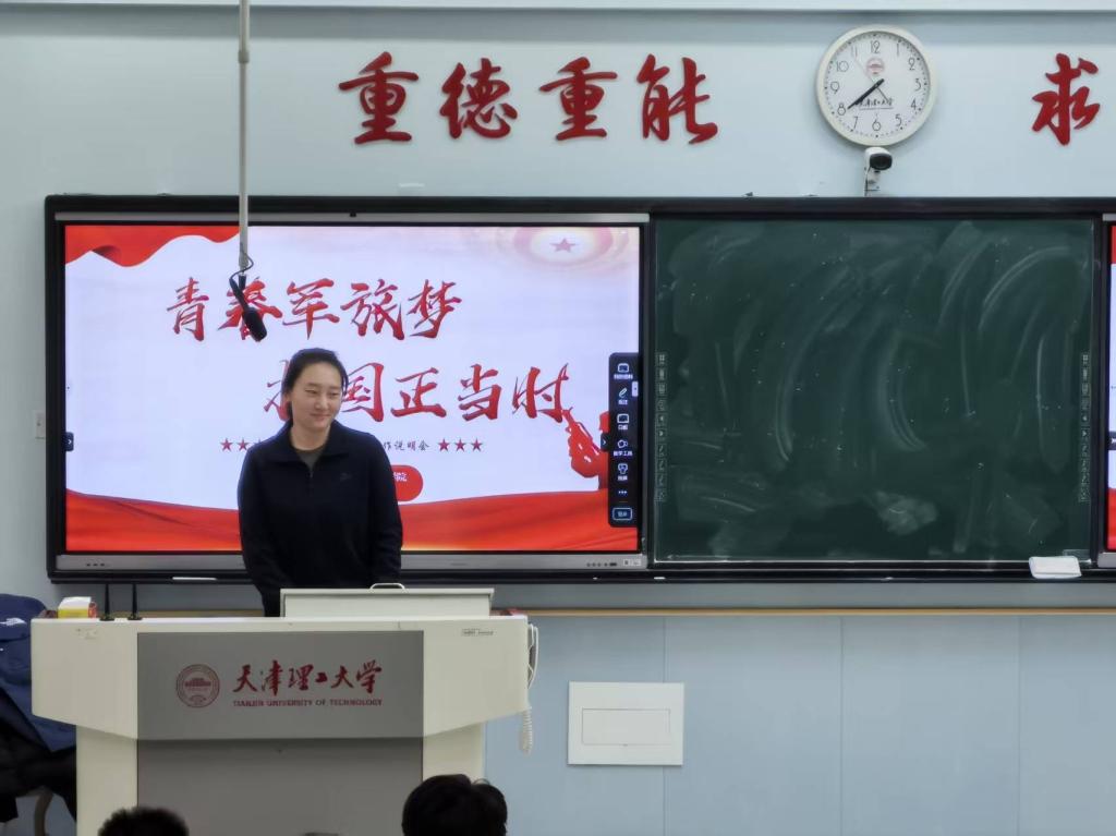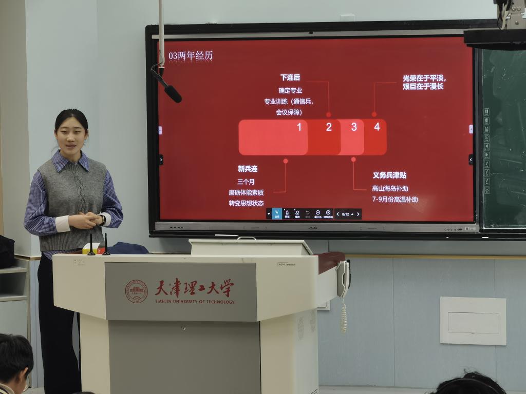 宣讲会上,四位退役大学生以亲身经历为笔,勾勒出军营生活的热血图景。牟文博结合自身服役经历,系统解读了大学生入伍的各项条件与政策,从报名流程到优待保障,从发展空间到成长路径,为同学们提供了全面、权威的指导;卢愈君则以退役后成功考取研究生的经历为切入点,深入剖析了退役大学生在考研升学中的专项政策与优势,用数据与案例为同学们铺就一条清晰的升学规划之路;宋雅欣以铿锵有力的语言,分享了军营中锤炼出的坚韧品格与家国情怀,号召同学们以青春之名,赴军营之约;靳天博则围绕征兵流程的细节要点与退役复学后的适应策略展开分享,从体能训练到学业衔接,从心理调适到时间管理,为同学们提供了切实可行的建议。