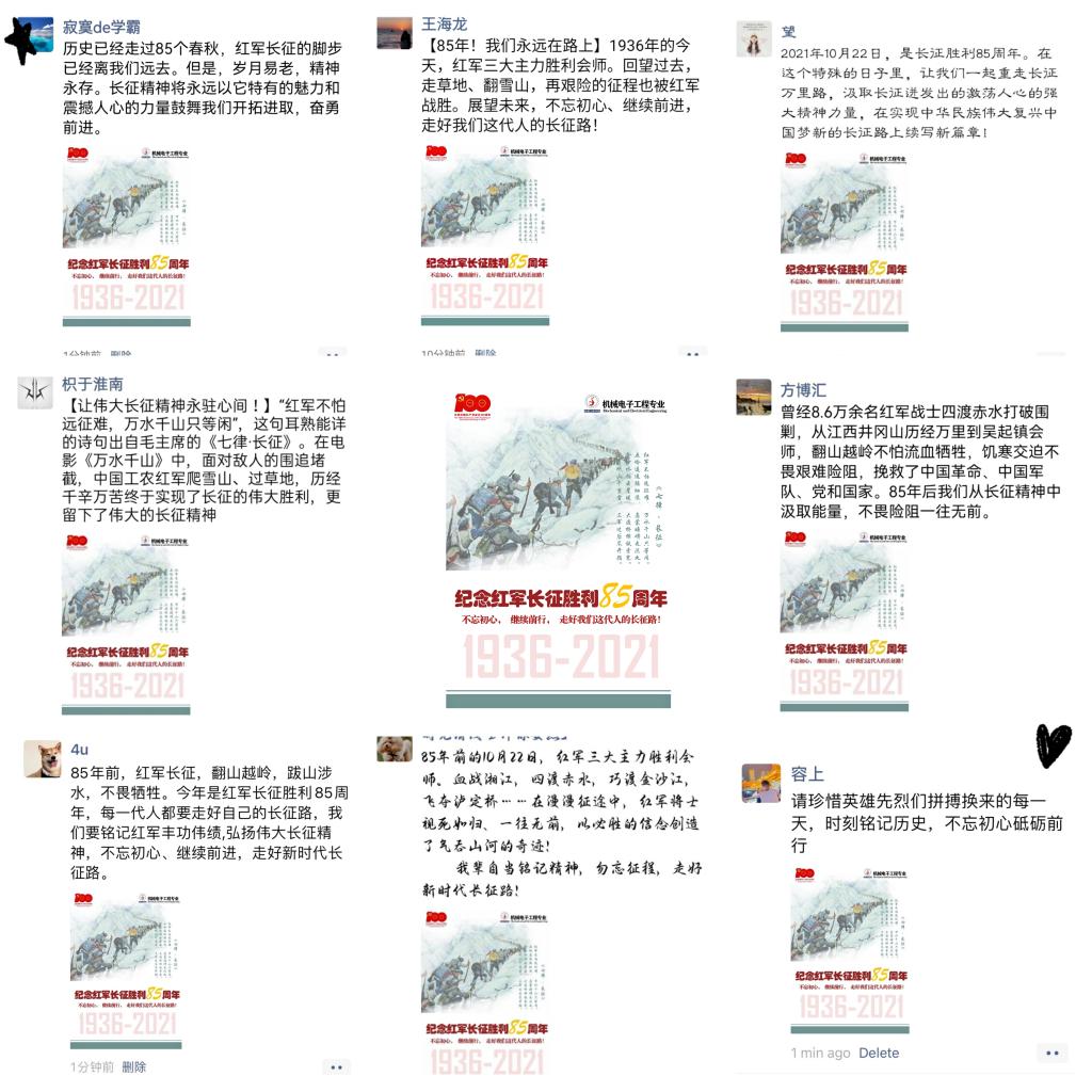 活动中,2019级预备党员安林春带领同学们回顾长征历史,全方位、多角度的对长征精神进行了深刻解读,生动形象的故事反映了我们党带领红军长征的艰难不易,同学们深受震撼和感动;2019级预备党员徐振宁结合党史学习教育,回答了当代大学生如何弘扬伟大长征精神,走好今天的长征路”的提问,同时面向同学们发起继承和弘扬长征精神,赓续红色基因线上云宣传活动,百余名同学积极转发评论,反响热烈。