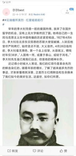 党员朱倩怡说:李大钊先生虽已离我们远去,但是他的精神长存。还记得小时候大人常说,我们的红领巾是革命先烈的鲜血染红的。随着年龄的增长,了解了越来越多先烈的事迹,才渐渐懂得其深意,正是烈士们用鲜血和生命换来了我们如今的美好生活。这盛世,如你们所愿。