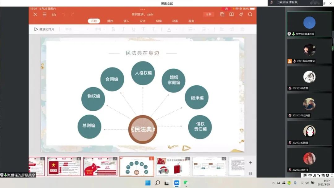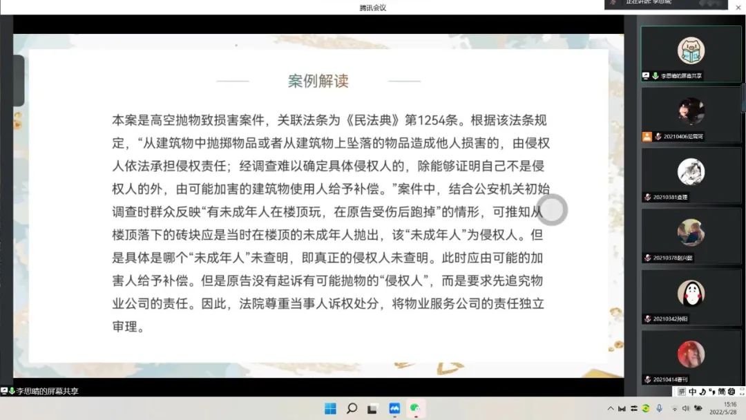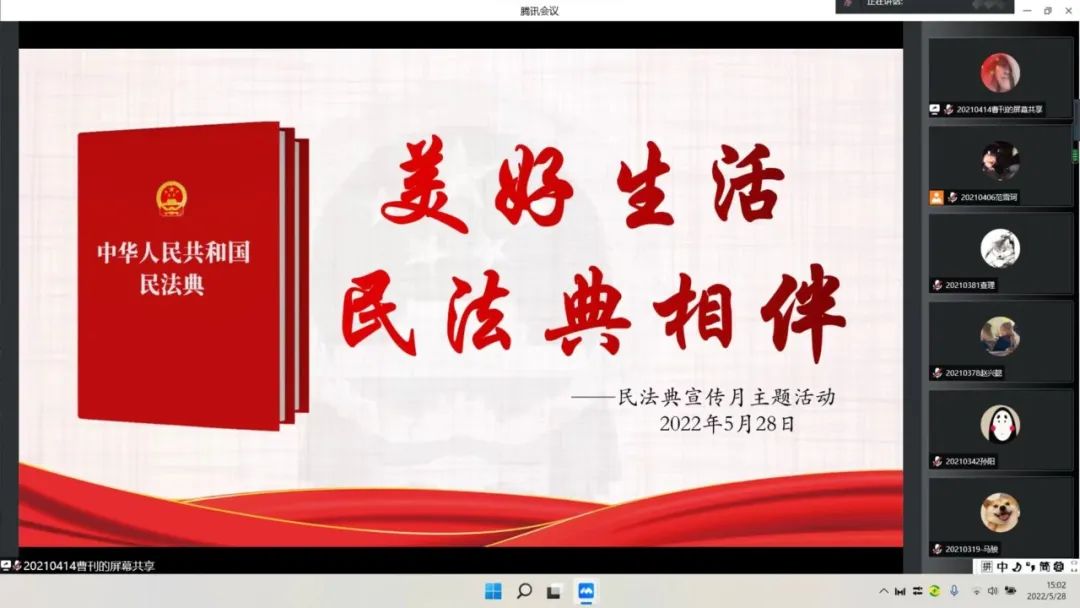 会上,张世瑶对民法典内容及修订的重要意义进行了阐述,李思晴分别从高空抛物、虚拟财产、人脸识别、网贷四个与大学生息息相关的实际案例向我们更进一步展现民法典的作用及重要性,充分体现了民法典“人民至上”的理念。活动最后,田换林老师就再次强调新时代大学生提升法律意识的必要性,希望同学们提升法律意识,做新时代知法、懂法、守法、用法的青年,保护自己合法权益。