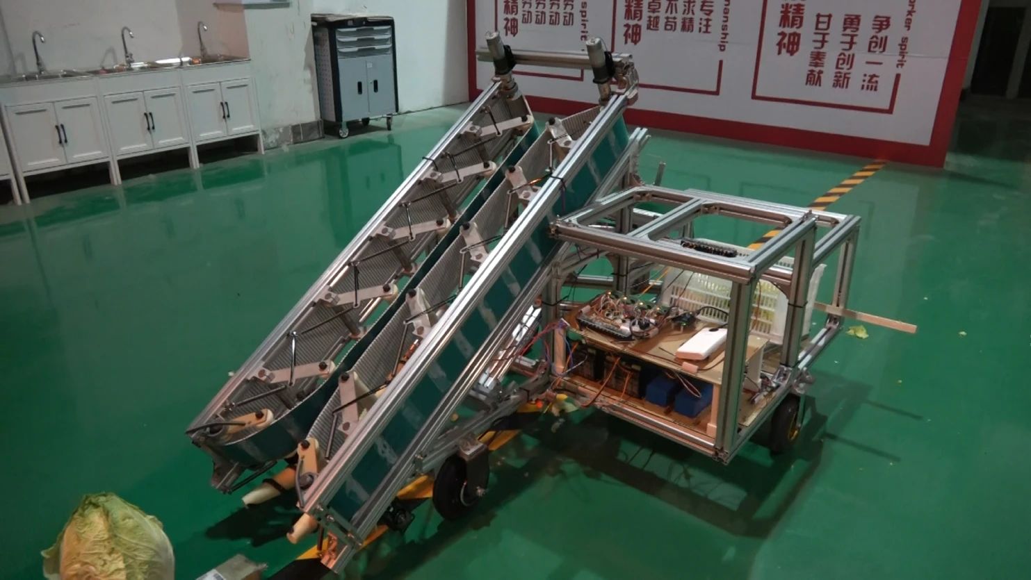 本次二等奖的获奖作品《“择青”——面向智慧农业应用的智慧节能自走式大白菜收获机》由工程训练中心教师许旺蓓和我院教师王巨涛指导,学生黄星瑞、李妍、游佳、林煜阳、 李泽昱、齐宇婷、赖奕恒共同完成。该团队设计了一种能够自适应不同栽培场景下的智慧节能白菜收获机,其可通过调整前部夹持机构以及V型输送带间距,实现多种蔬菜的引拔收获,在面对农场多种蔬菜的收获作业要求时,可以借助机构的微调,适应更多的蔬菜收获作业需求。通过对各机械部分的节能减排优化设计,显著提高大白菜智能收获机的工作效率,降低能耗,并减少碳排放。这些措施不仅提升了设备的经济效益,还为智慧农业的可持续发展提供了技术支持,有助于实现农业生产的绿色环保目标。