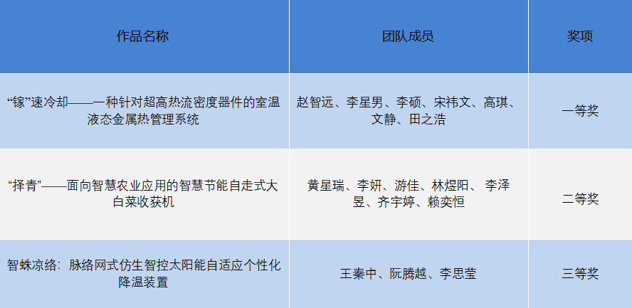 本次一等奖的获奖作品《“镓”速冷却——一种针对超高热流密度器件的室温液态金属热管理系统》,由我院教师张明宽指导,学生赵智远 、李星男、李硕、宋祎文、高琪、文静、田之浩共同完成。该项目设计了一种多流道结构——歧管微通道结构,将原本微通道热沉连续的长距离流动转化为分段的多个短程流动,解决了液态金属主流温升引起的对流传热能力下降的难题。基于此结构,设计并搭建一套针对超高热流密度电子器件的液态金属冷却系统。系统主要由歧管微通道热沉,驱动泵和管翅式换热器组成。计算结果表明,对流换热系数,是传统水微通道热沉的 10 倍。大大提高了超高热流密度的散热极限,降低了原本微通道热沉压降消耗。