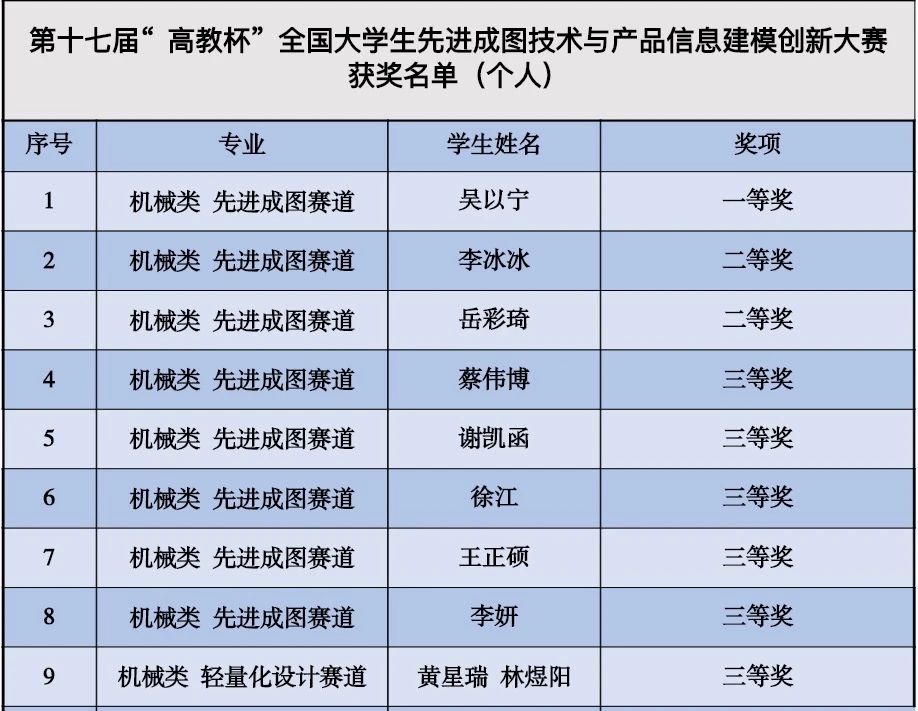 近日,第十七届“高教杯”全国大学生先进成图技术与产品信息建模创新大赛总决赛在贵州大学落下帷幕。本届大赛共吸引了全国895所高校、16294名选手线下参赛,规模空前,人数之多创下历届赛事之最。在此次比赛中,我院学子表现出色,首次参加团体赛道并斩获二等奖,个人赛再创佳绩,斩获一等奖1项,二等奖2项,三等奖6项,实现了获奖数量与等级的新突破。获奖名单如下: