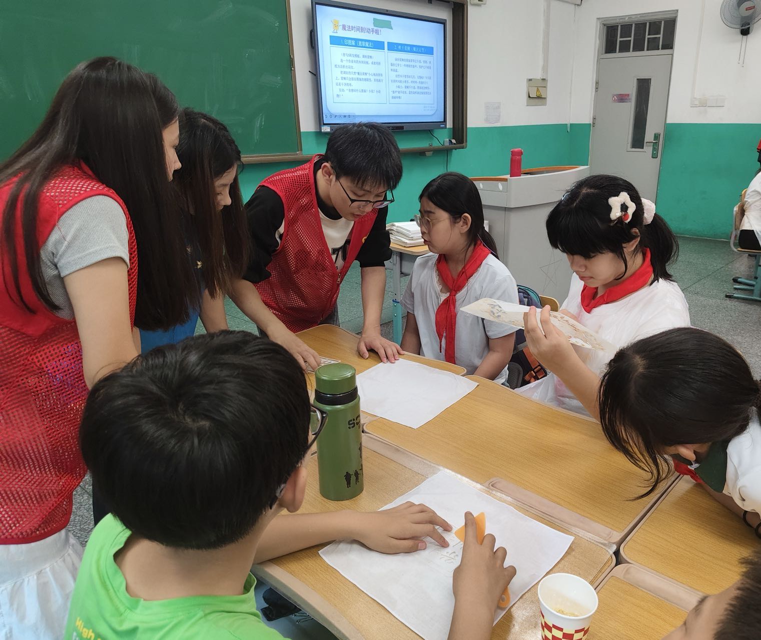 志愿者从蓝印花布的历史入手,带同学们领略非遗的魅力,在随后的实践环节中逐步指引,从“型糊染工艺演示”,到“将防染浆刮入模具形成图案”,再到“染色吹干、洗去浆糊”,学生们认真跟随步骤操作,亲手制作属于自己的蓝印花布作品,在指尖互动中感受非遗文化的独特魅力,进一步加深对中华优秀传统文化的认知与热爱。