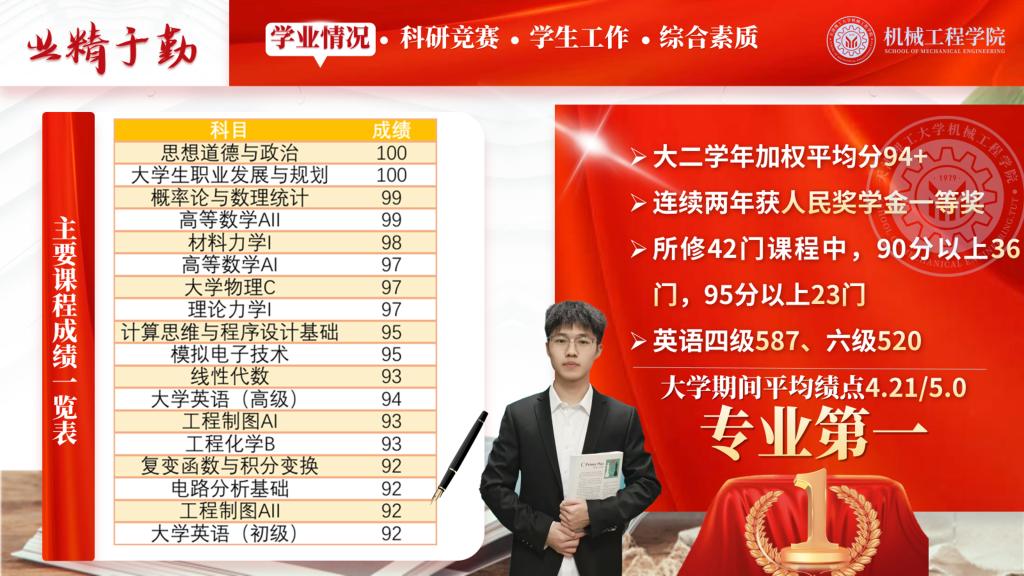 恪守本心,方能笃行致远。他用踏实的脚步,践行着“重德重能、求实求新”的校训,诠释了新时代机械学子的担当与锐气。荣誉是过往的注脚,未来是更广阔的星辰大海。未来,他将不辍耕耘,努力以所学所能贡献社会、报效国家。