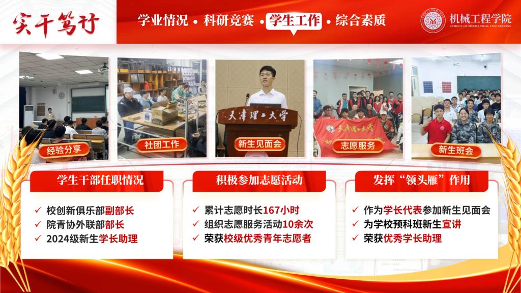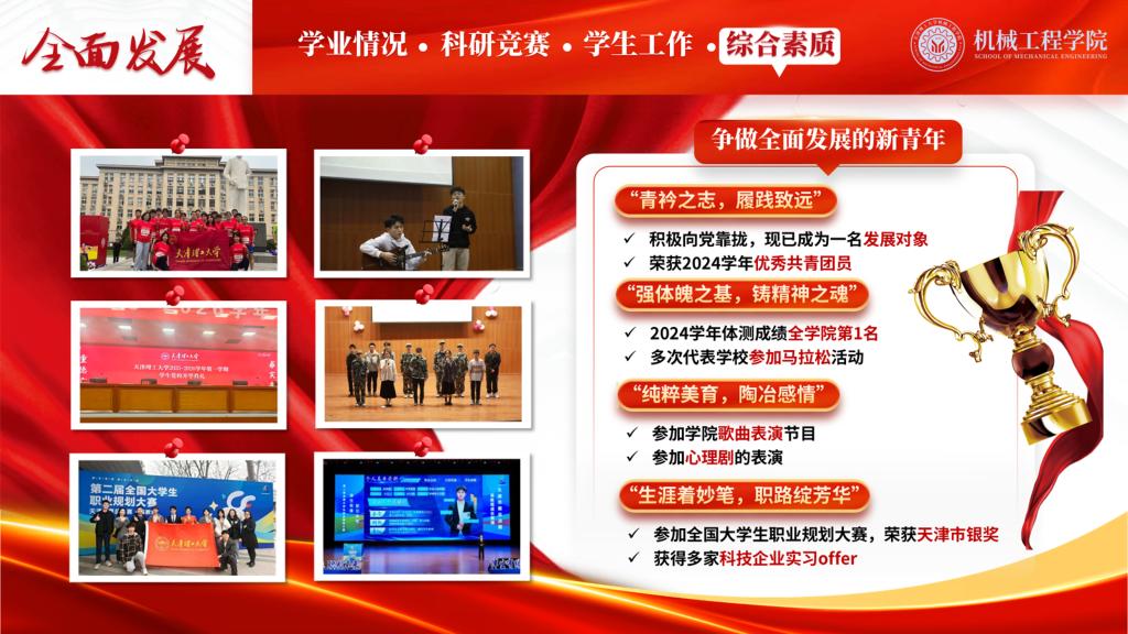 知行合一,全面发展。他追求“知行合一”,在实践中锤炼综合素养。他思想积极上进,已成为一名党员发展对象;热爱体育运动,多次参加马拉松活动,曾在体测中获得学院第一名的成绩;积极参加美育活动,如歌唱表演、心理剧等。除此之外,他还参加了全国大学生职业规划大赛,并从全市52所高校23.7万参与人当中脱颖而出,获得天津市银奖,并凭借出色表现,获得多家科技企业的实习offer。