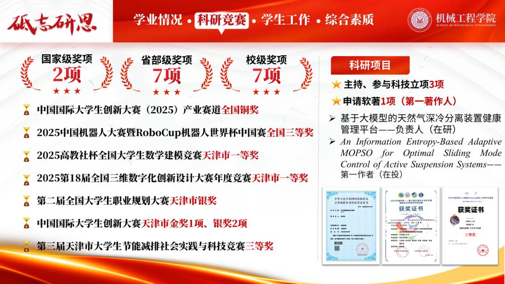 致知穷理,创新突破。他秉承以赛促学的理念,在科创赛道上屡创佳绩,累积斩获国家级奖项2项,省部级奖项7项,校级奖项7项;但他不止步于竞赛,更将目光聚焦于科技前沿,主持、参与2项大创项目以及1项学术科研项目,以第一著作人发表软著1项,另有一篇SCI论文在投,展现了扎实的科研攻坚能力。