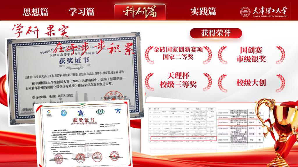 他始终坚信“实践出真知”,积极投身科研竞赛,在挑战中锤炼创新思维与实操能力。作为核心成员,他参与多项重要赛事,荣获2024一带一路暨金砖国家技能发展与技术创新大赛国家级二等奖、国创赛市级银奖、天理杯三等奖等荣誉,累计斩获国家级奖励1项、省部级奖励3项、校级奖励1项,参与申报1项校级大创项目,用实际行动诠释了新时代青年的创新精神与实干力量。