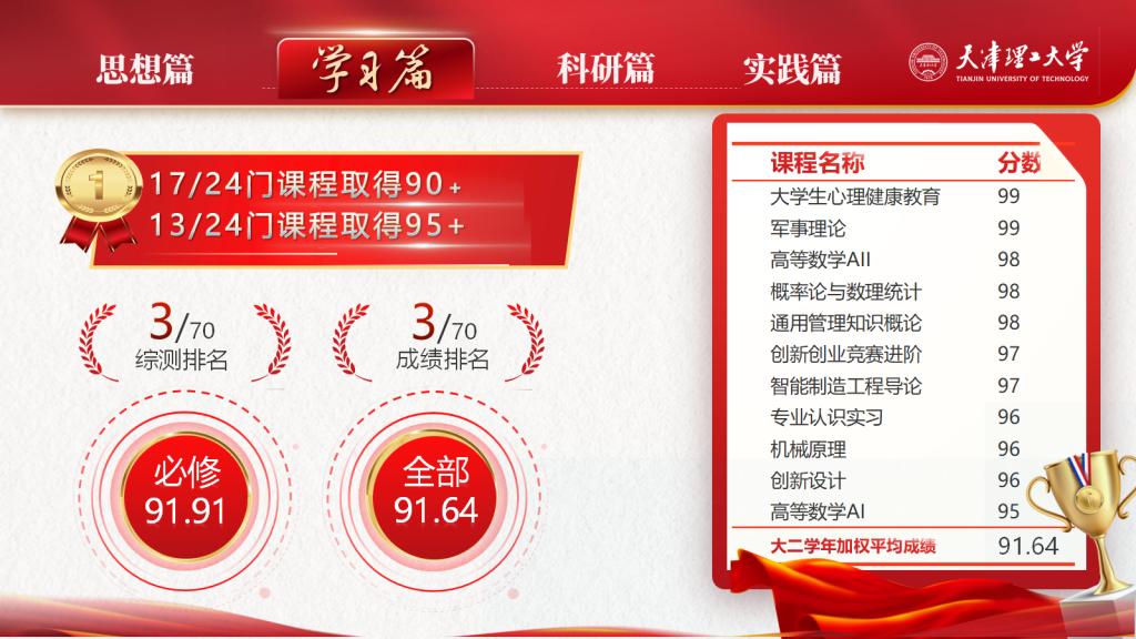 他始终将“学业为本”刻在心中,以严谨务实的态度深耕专业知识。大二学年加权平均成绩91.64分,加权平均绩点4.0,位列专业第三名;所学42门课程中,29门课程达到90分以上,19门课程突破95分。荣获天津市优秀学生、人民奖学金二等奖、“理工之星”优秀学生干部、校级优秀共青团干部、优秀学长助理、校级“三好学生”等10余项奖励,并带领班级荣获“校级先进集体”荣誉称号。