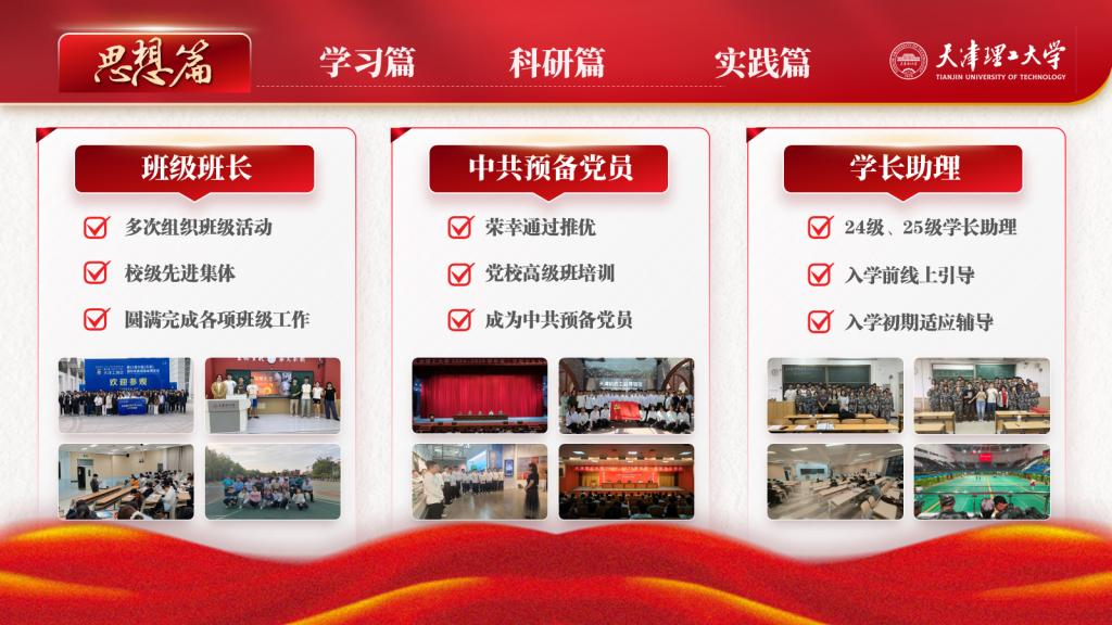 他积极向上,现已成为中共预备党员。作为班级班长,他认真统筹班级事务,圆满完成各项工作,营造互助共进的班级氛围;身为第二十一期校青马成员,他积极参与理论学习与实践锻炼,把青马精神转化为服务动力;作为两届学长助理,他提前开展线上入学引导,在新生入学初期主动提供校园适应、选课指导、时间规划等建议;作为校清朗学堂朋辈讲师,他结合自身学习经验,面向低年级同学分享学科的重难点突破方法与高效学习技巧。用实际行动诠释“服务他人、共同进步”的宗旨。