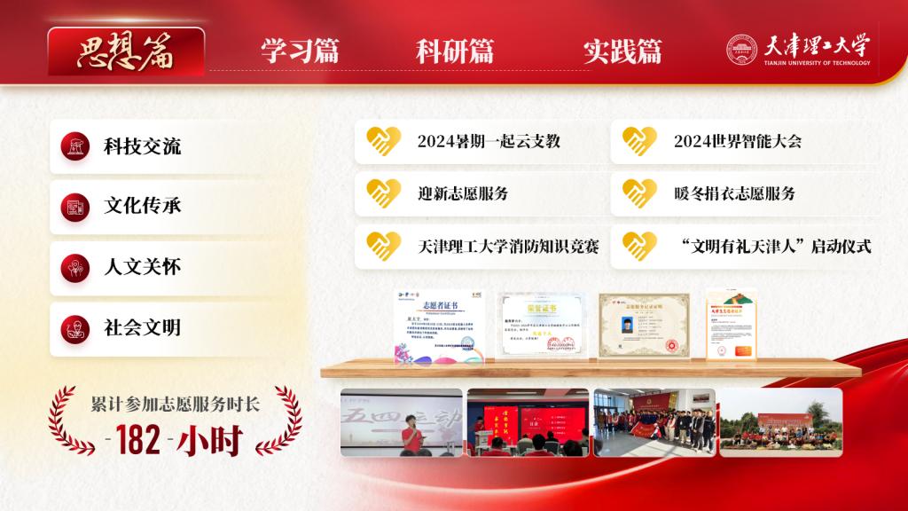 他积极投身志愿服务,用行动传递温暖力量。累计志愿时长已超182小时,凭借突出的志愿服务表现,他获评校级“优秀青年志愿者”称号。用脚步丈量责任,用行动传递温暖,展现了新时代大学生的社会责任感与实践能力。